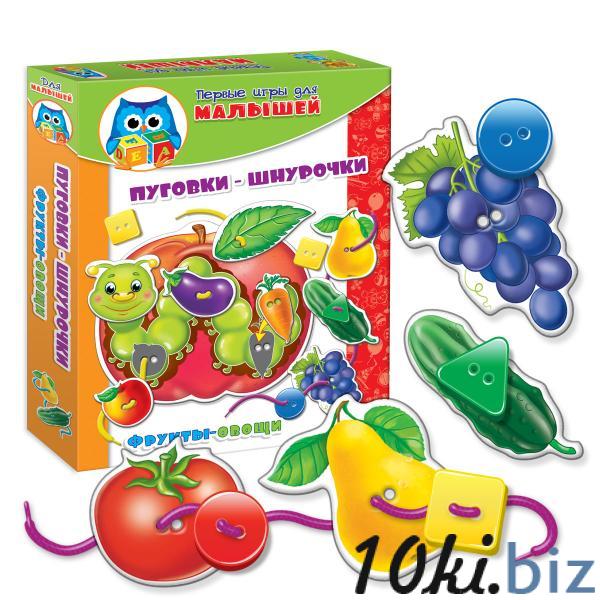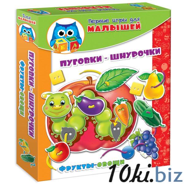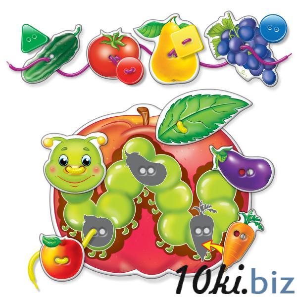 В наборе «Фрукты-овощи» вы найдете большое яблоко с веселой Гусеничкой. К нему нужно пришнуровать картонные фрукты и овощи, а также крупные яркие пуговицы, от которых ваш ребенок будет в восторге!