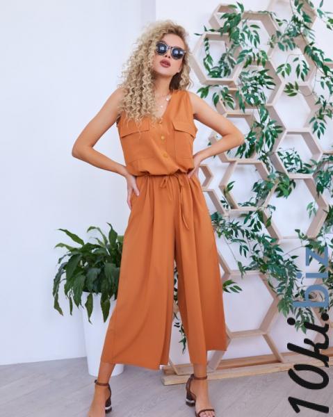 Бежевый комбинезон из софта с прямыми свободными укороченными брюками. Модель с кулиской на талии оснащено укороченной планкой и V-образной горловиной. Изделие без рукавов оснащено карманами.
