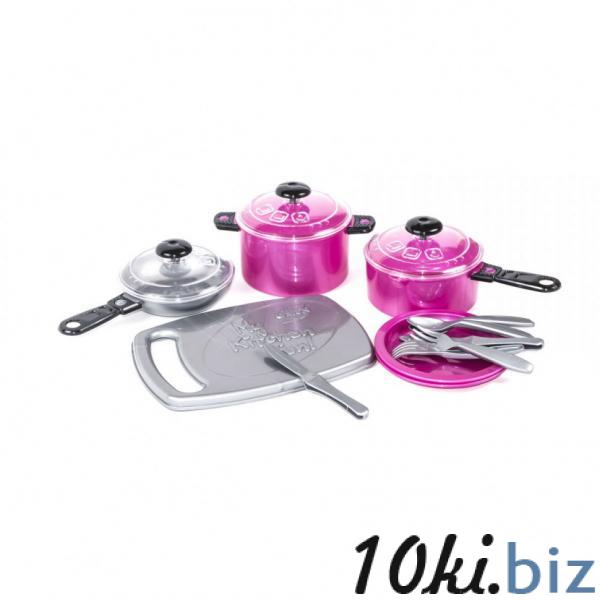 Набор яркой пластиковой посудки. В комплекте: досточка (19 х 13 см), кастрюлька с крышечкой, кастрюлька с ручкой и крышечкой, сковородка с крышечкой, 2 тарелки, 2 вилки, 2 ножа и 2 ложечки.