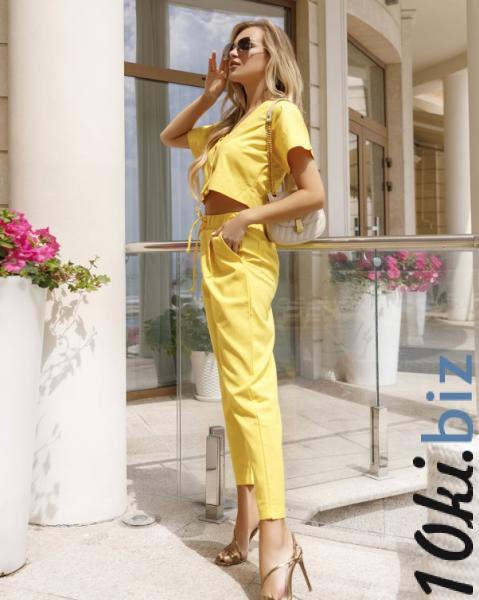 Льняной костюм яркого желтого цвета из укороченных брюк с карманами и кроп-топа. Топ на пуговицах с цельнокроенными короткими рукавами и V-образной проймой горловины. Брюки-бананы высокой посадки с поясной резинкой и фиксирующей тесьмой на талии.