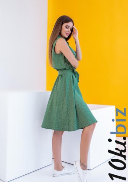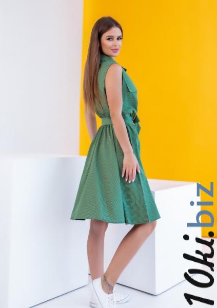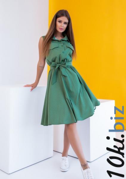 Летнее платье-рубашка из софта цвета хаки с белым мелким горошком. Модель приталенного кроя с воротником и декоративными клапанами оснащена планкой на пуговицах. Изделие с длиной до колен оснащено расклешенной свободной юбкой и съемным поясом.