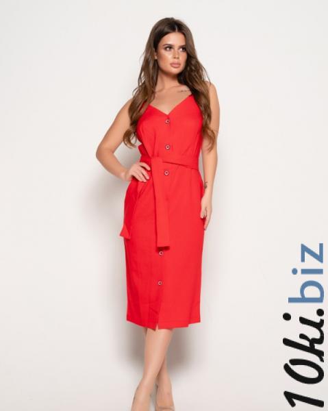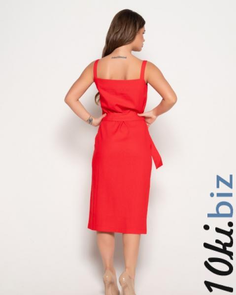 Ярко-красный сарафан с вертикальной планкой на пуговицах выполненный из практичного не эластичного льняного материала. Модель миди длины с широкими бретелями и V-образным декольте. Изделие практичного прямого кроя приталено съемным поясом.