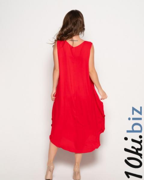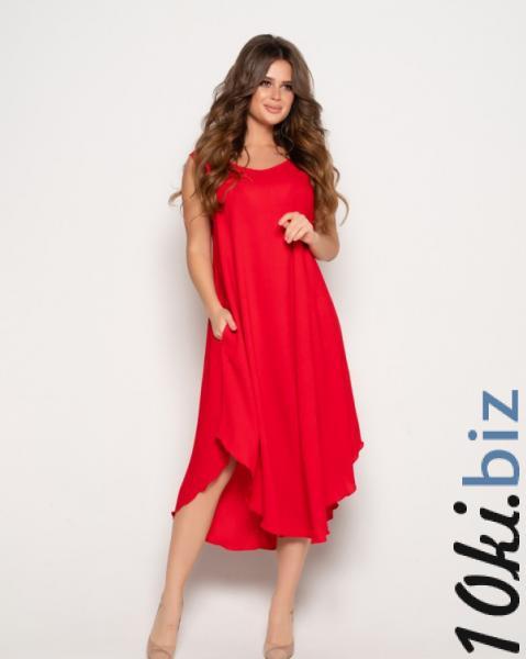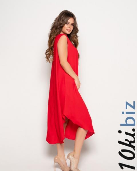 Крепдешиновый асимметричный сарафан однотонного красного цвета с расклешенным свободным кроем и скругленными нижними срезами. Изделие миди длины оснащено боковыми карманами, горловиной-лодочкой и удобными проймами рукавов.