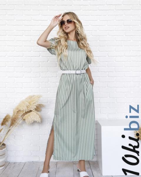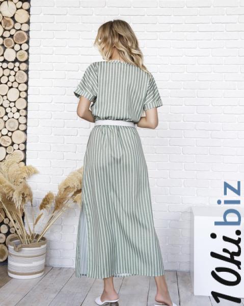 Летнее платье прямого кроя с кулиской и короткими цельнокроенными рукавами с подворотами. Модель оснащена горловиной-лодочкой и симметричными боковыми разрезами. Платье макси длины выполненное из полосатого коттона цвета хаки.