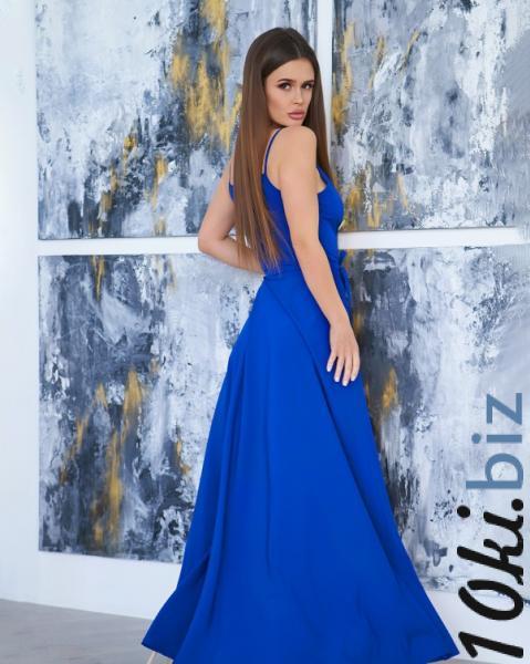 Синий сарафан из тонкого софта на тонких бретельках с кроем на запах. Модель макси длины с расклешенным низом и втачным пояском.