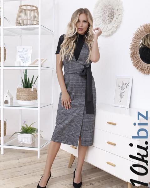Темно-серый офисный сарафан на широких перекрещивающихся на спине бретельках с V-образным декольте. Модель выполнена из практичной клетчатой костюмки с боковой молнией и и черным втачным декором. Модель миди длины с прямым кроем и боковым разрезом.