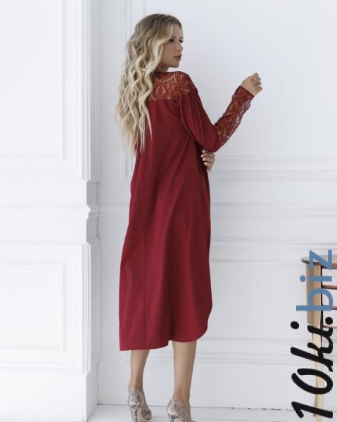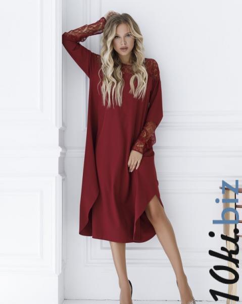 Свободное платье-трапеция расклешенного кроя с асимметричным нижним срезом. Модель выполнена из бордового софта с гипюровой вставкой в тон. Изделие оснащено длинными прямыми рукавами и полукруглой проймой горловины.