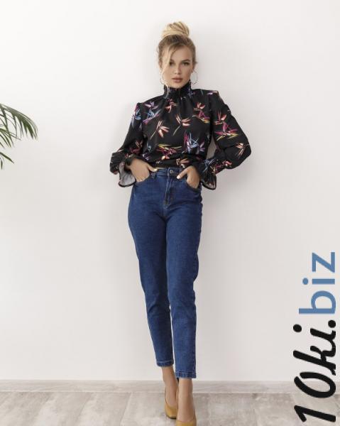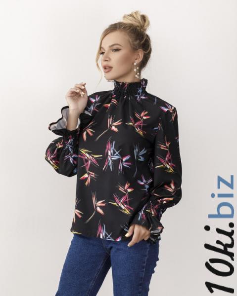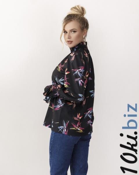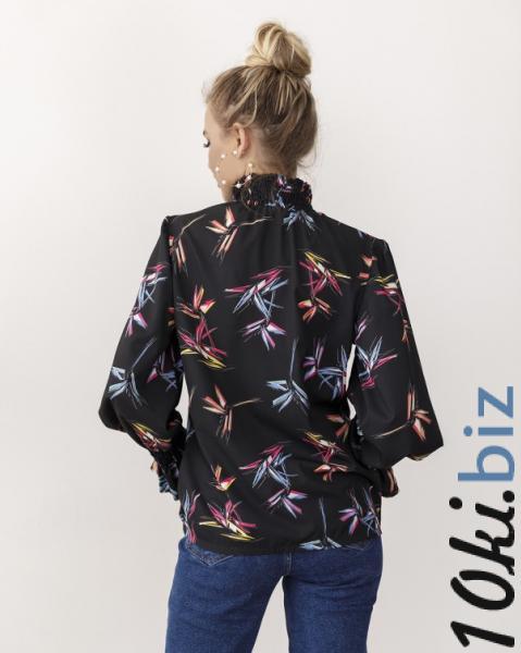 Черная оригинальная блуза выполненная из принтованного софта с прямым свободным кроем и съемным поясом. Модель с прямыми рукавами и воротником оснащена декоративной жаткой и воланами.