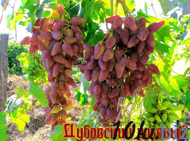 Дубовский розовый - благодаря своим внешним данным, самая популярная на сегодняшний день гибридная форма приватной селекции Гусева Сергея Эдуардовича. Кусты сорта сильнорослые,Срок созревания ранний. Тип цветка обоеполый. Грозди конические, иногда с крылом, умеренной плотности и рыхлые. На взрослых кустах масса гроздей достигает 1500гр. Ягоды ярко-малинового цвета, сосковидные, очень крупные, до 5,5-6см в длину, массой до 18-20гр. Мякоть плотная, хрустящая, кожица не ощущается при еде. Вкус гармоничный, без мускатного аромата. Ягоды способны накапливать до 20-21% сахара, семян в них мало. Плодоносность глазков и урожайность сорта очень высокая, требуется нормирование гроздей. Устойчивость к болезням и морозу средняя. Сорт обладает хорошей транспортабельностью и высочайшими товарными качествами. Для Дубовского Розового рекомендуется средняя длина обрезки плодовых лоз на 6-8 глазков. Лоза вызревает хорошо.