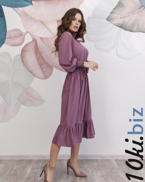 Демисезонное платье с высоким воротником и манжетами выполненными из жатки. Модель приталенного кроя выполнена из тонкого софта и декорирована нижним воланом. Платье миди длины с широкой резинкой на талии и длинными рукавами. Изделие выполнено и- однотонного софта приглушенного темно-сиреневого цвета.