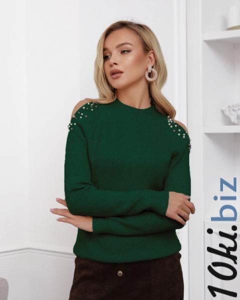 Зеленый нарядный свитер декорированный вырезами на плечах с декором в виде бусин и страз. Модель с манжеткой на О-образной горловине и длинными рукавами-реглан. Изделие прямого кроя с фактурными манжетами. Свитер связан из шерсти и обладает высокой эластичностью.