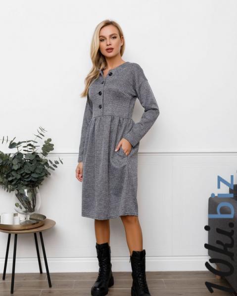 Классическое серое приталенное платье до колен выполненное из фактурного трикотажа средней эластичности. Модель с прямой присборенной на талии юбкой оснащено длинными рукавами и укороченной планкой на пуговицах. Изделие с полукруглой проймой горловины оснащено боковыми карманами. Сбоку потайная молния.