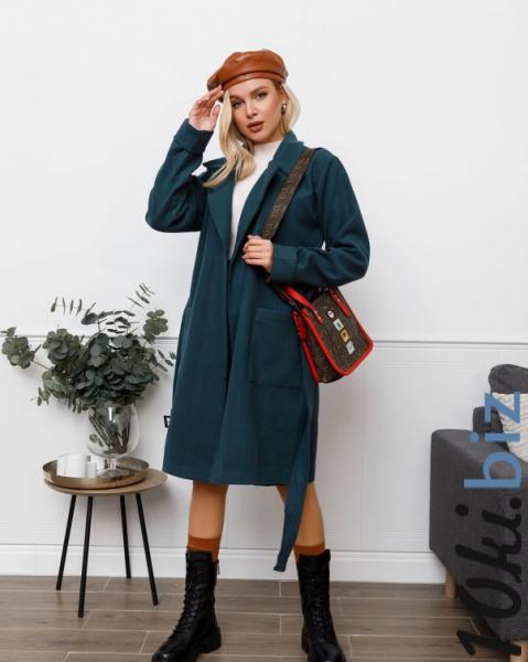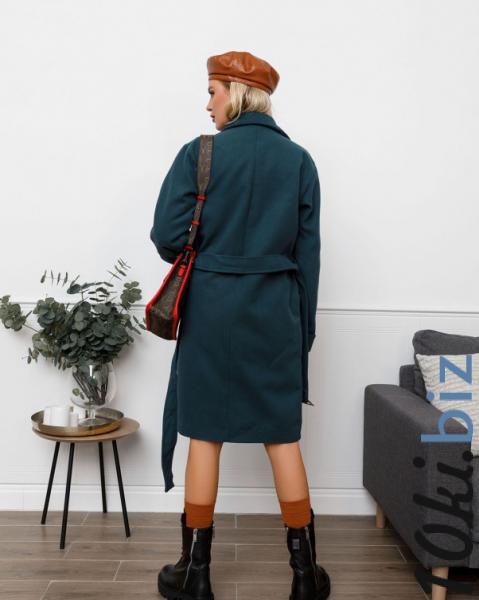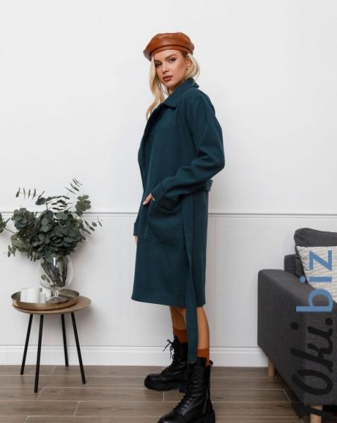 Кашемировое зеленое пальто на запах со съемным поясом с пряжкой. Модель без застежек и нижнего подклада. Пальто прямого свободного кроя с воротником и длинными рукавами с подворотами. Изделие ниже колен с накладными карманами.