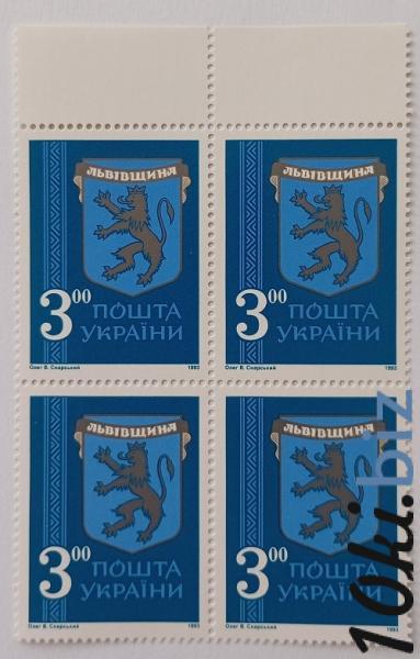 1993 № 35 квартблок почтовых марок Герб Львовщины номинал 3-00 Филателия в Украине