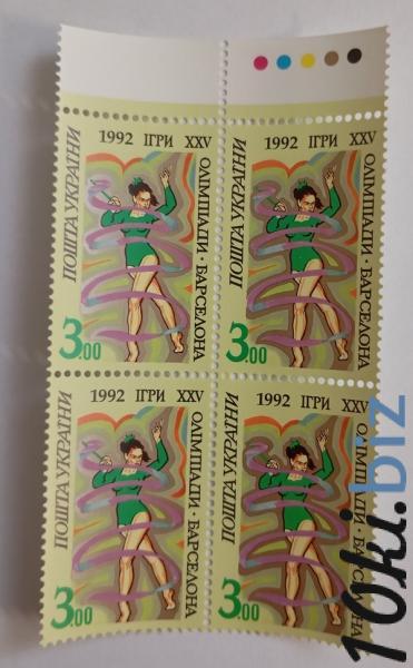 1992 № 23 квартблок почтовые марки Игры XXV Олимпиады в Барселоне. Гимнастка с лентою. (3.00) Филателия в Украине